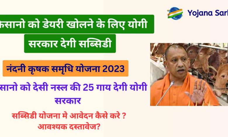 उत्तर प्रदेश की योगी सरकार द्वारा नंदनी कृषक समृधि योजना को शुरू करने की घोषणा अगस्त 2023 में द्वारा की गयी है। इस योजना के तहत योगी सरकार के द्वारा प्रदेश के किसानों और पशुपालकों को डेयरी खोलने के लिए 25 देशी उन्नतशील नस्ल की गाय उपलब्ध करवाई जाएंगी।इस योजना के तहत 25 दुधारू गायों की एक इकाई स्थापित करने की लागत 62,50,000/- रुपए आंकी गई है। ऐसे में योगी सरकार लाभार्थी को कुल खर्च का 50% यानी अधिकतम 31,25,000/- रूपए अनुदान देगी।