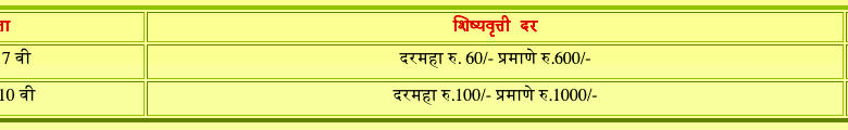 | 6 | दिल्या जाणा-या लाभाचे स्वरुप | प्रति विद्यार्थीनीस दरमाह रुपये 60/- याप्रमाणे 10 महिन्या करीता रु.600/- शिष्यवृत्तीची रक्कम संबंधीत लाभार्थ्यांस अदा केली जाते. |